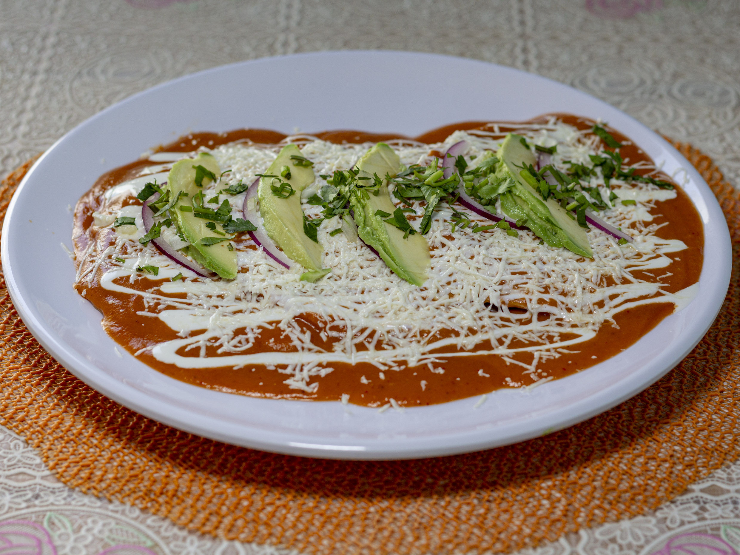 5 piezas de enchiladas de pollo o queso bañadas en salsa verde o roja con crema, queso, cebolla morada y aguacate