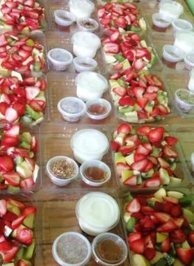 Papaya, Melón, Manzana, Plátano, Kiwi, Fresa, Yogur, Granola, Miel de abeja