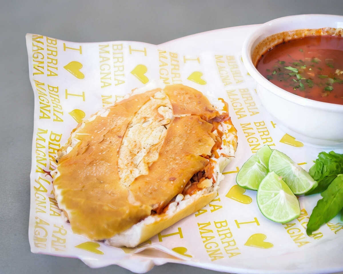 Torta Planchada de Nuestra ¡Birrealmente! Deliciosa Birria con Queso. Incluye: Salsa, limón y Verdura.