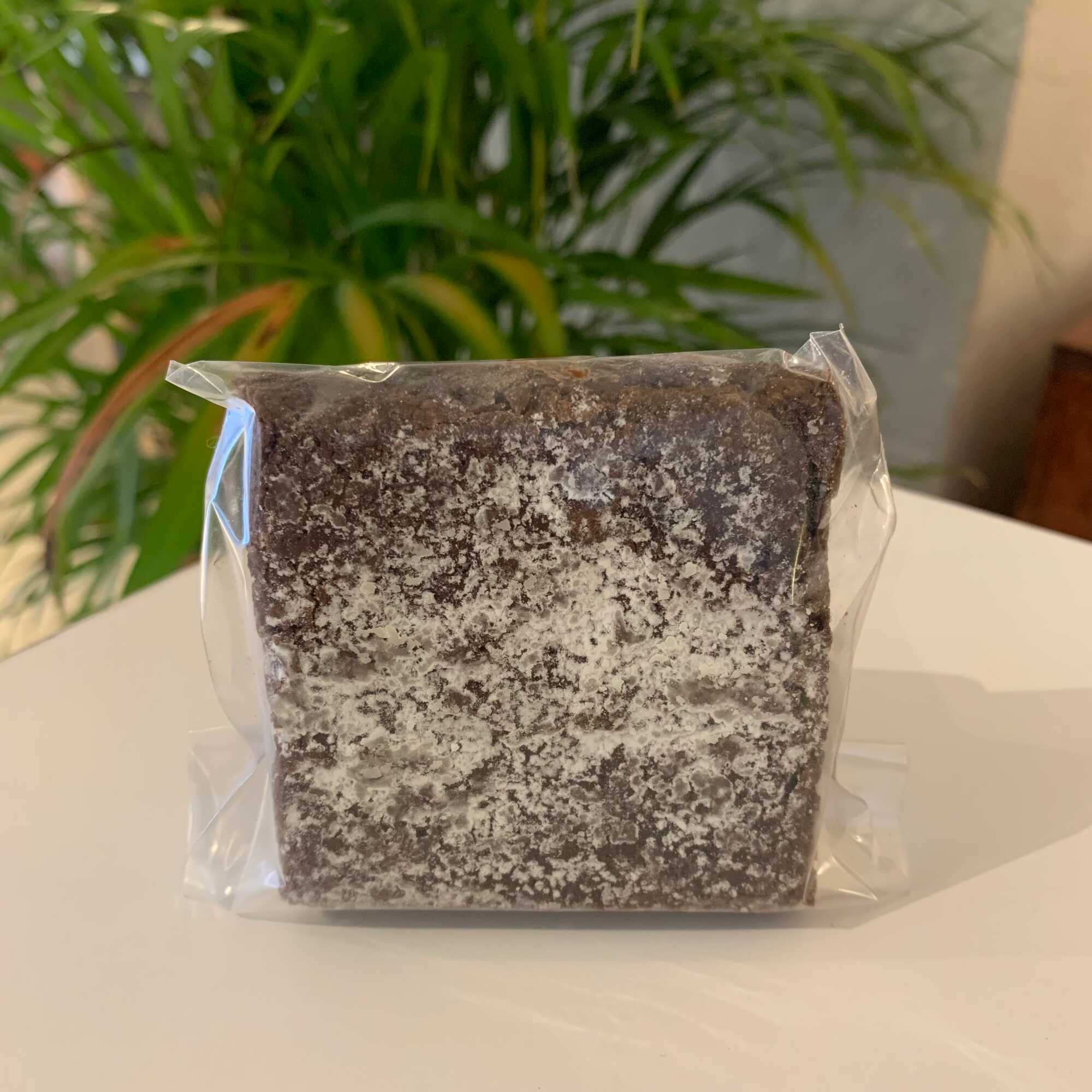 Pieza de brownie de chocolate semiamargo con leche, relleno de chispas de chocolate.