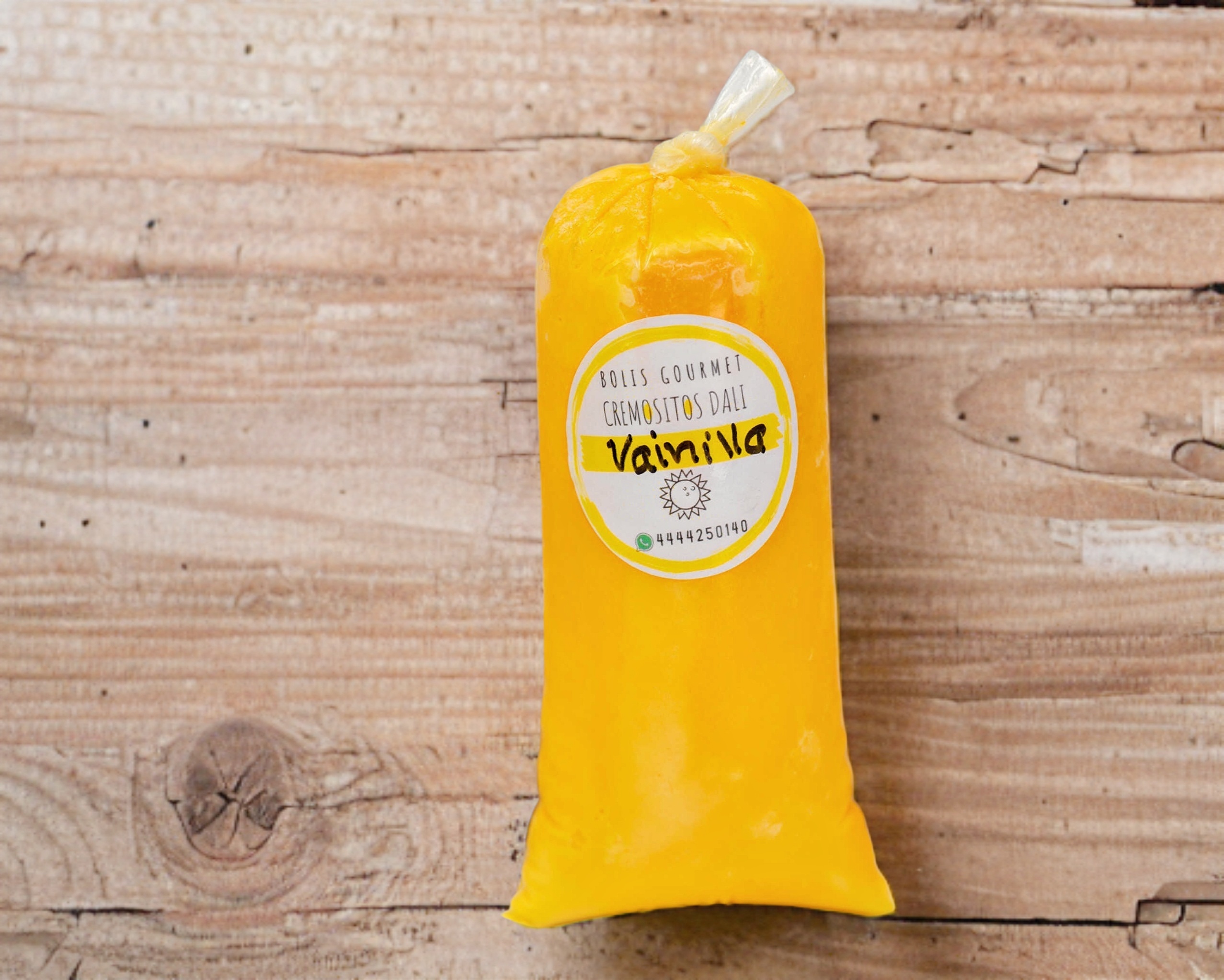 Delicioso bolis hecho a base de la tardicional receta de fresas con crema, contiene trocitos picados de fresas.