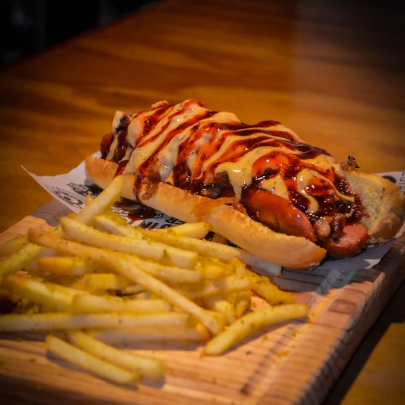 Acompañada con Chilli, queso americano, cebolla caramelizada y acompañada con papas a la francesa