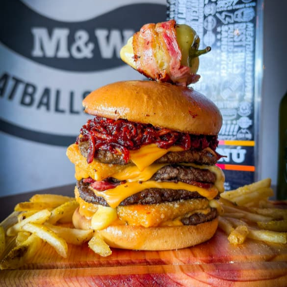 4 carnes de res, dos discos de queso, tocino, 4 quesos americanos, Pulled pork, mayones bones, 1 chile güero relleno de queso y salchicha y acompañada con papas a la francesa