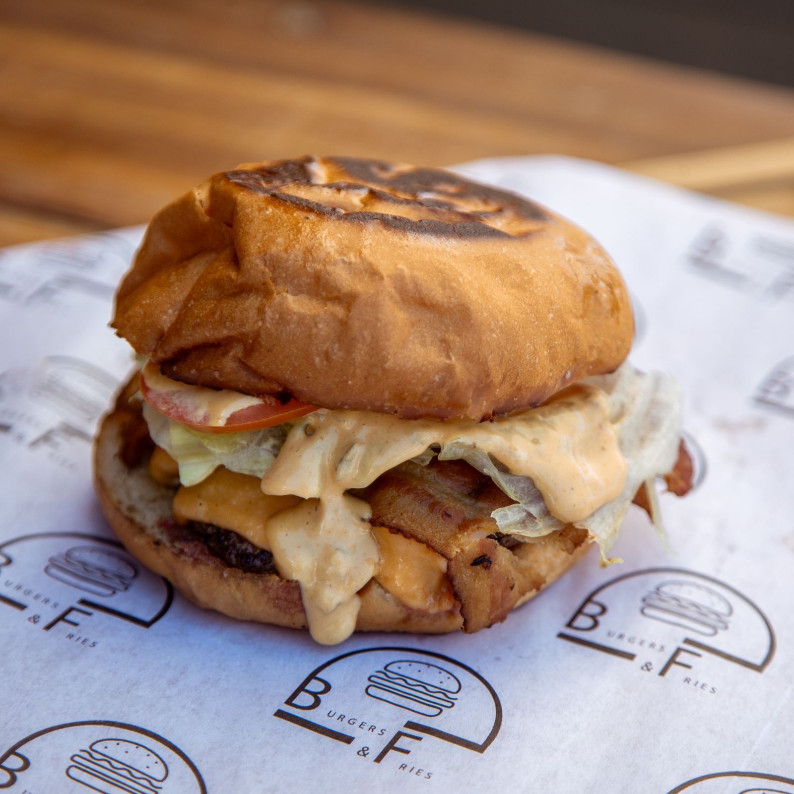 Doble carne angus 200 g, aderezo, tocino, cebolla caramelizada, queso amarillo y vegetales.