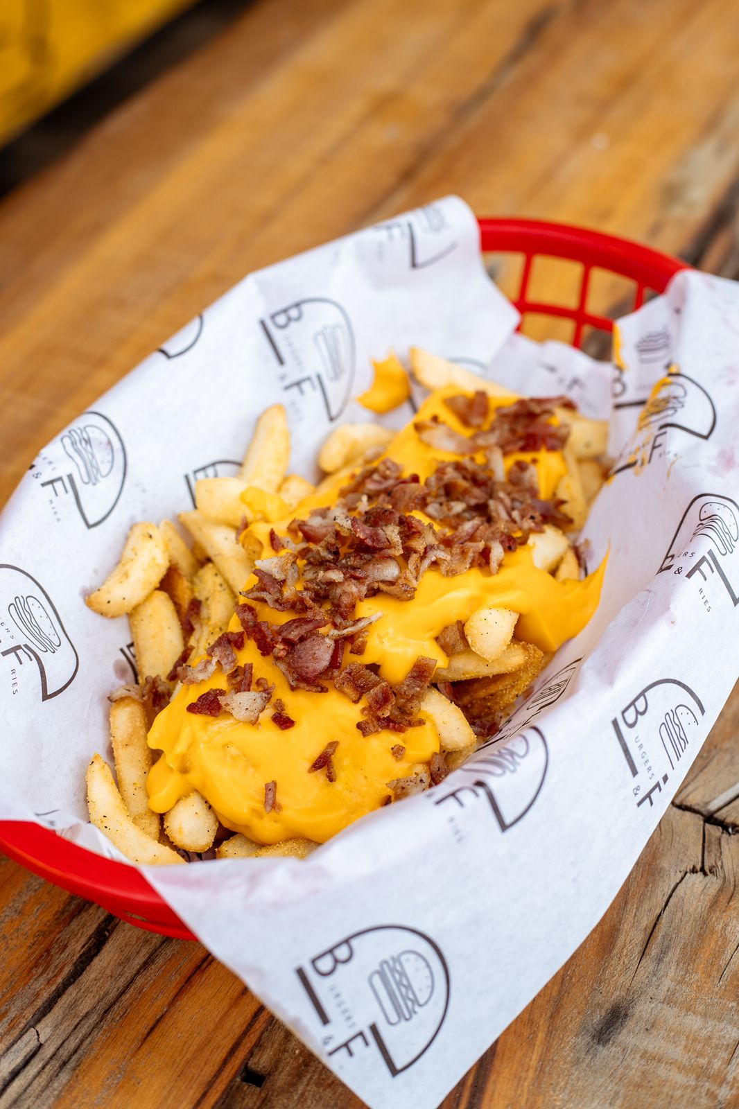 Papas a la francesa con queso amarillo y trocitos de tocino.