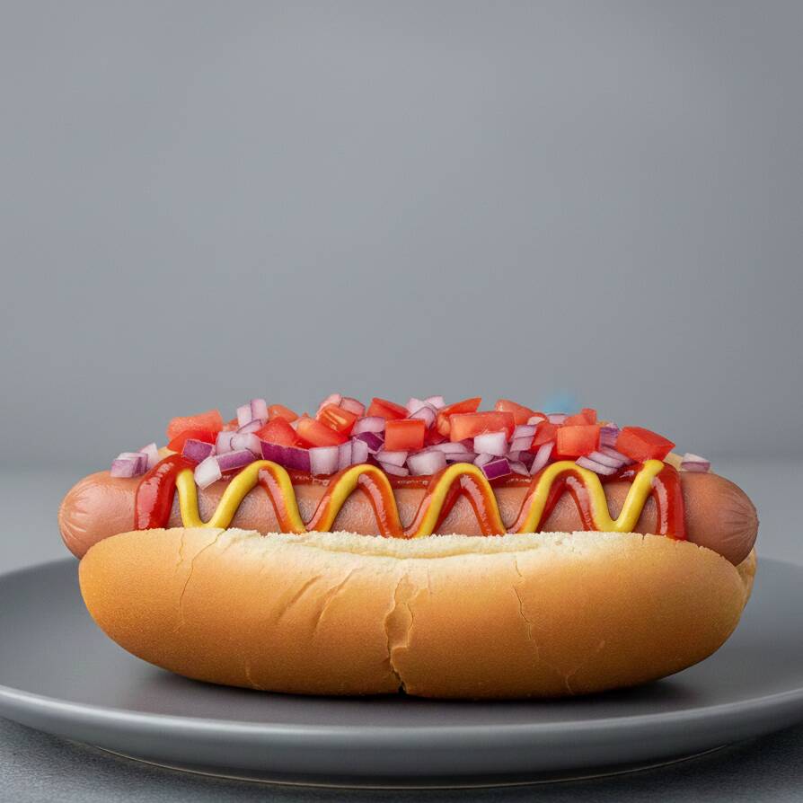 PAN, SALCHICHA, JITOMATE, CEBOLLA, CATSUP, MOSTAZA Y MAYONESA