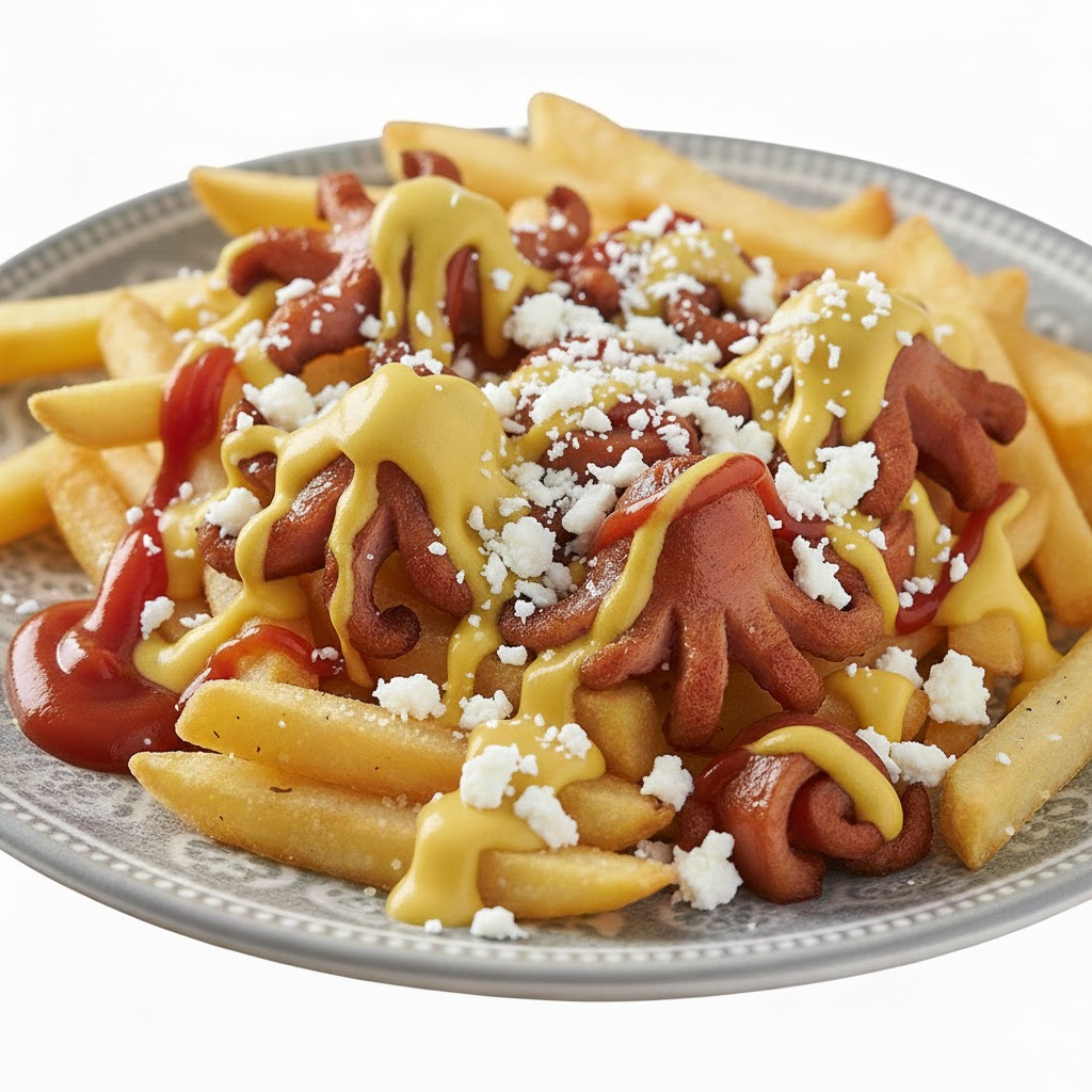 PAPAS A LA FRANCESA, SALCHICHA, QUESO AMARILLO, QUESO ASADERO, QUESO PARMESANO,CATSUP Y MOSTAZA