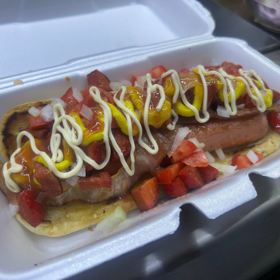 salchicha de pavo, tocino, jitomate, cebolla, mayonesa, mostaza, catsup