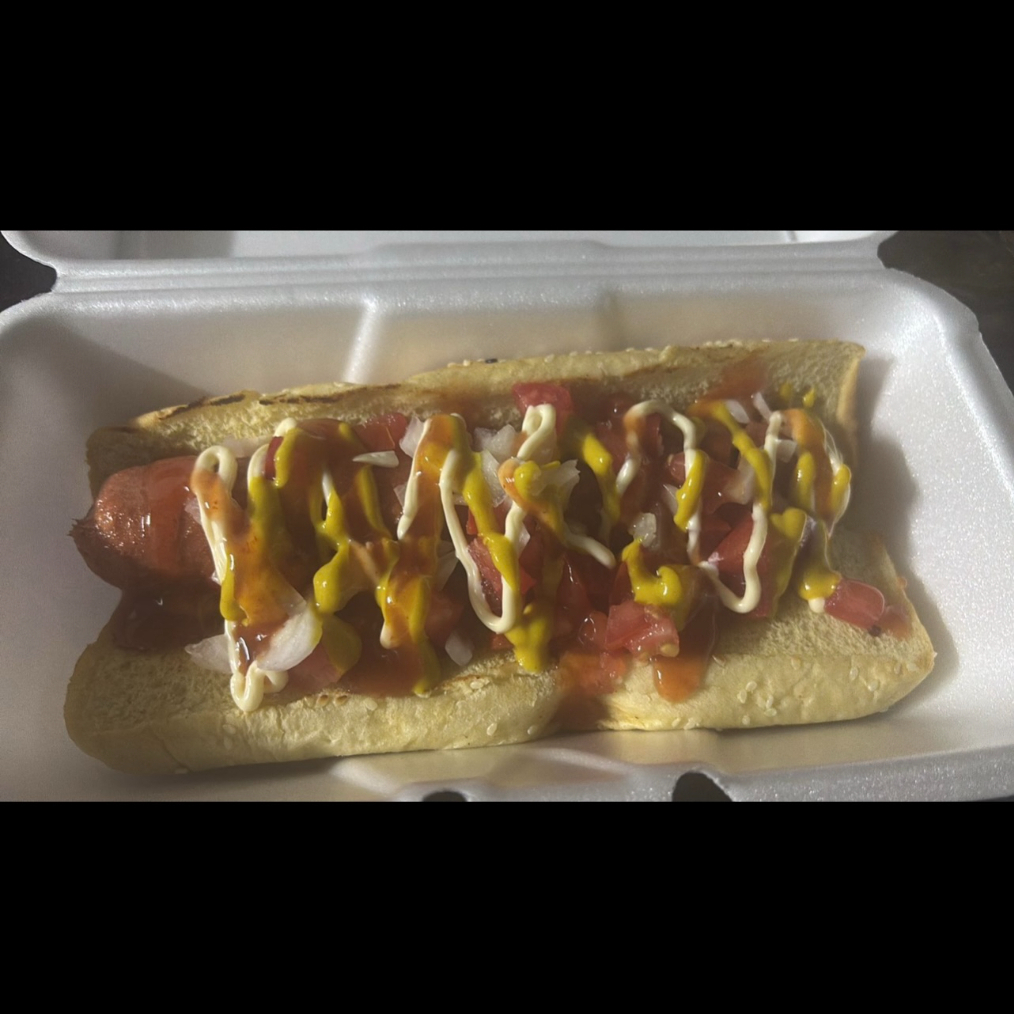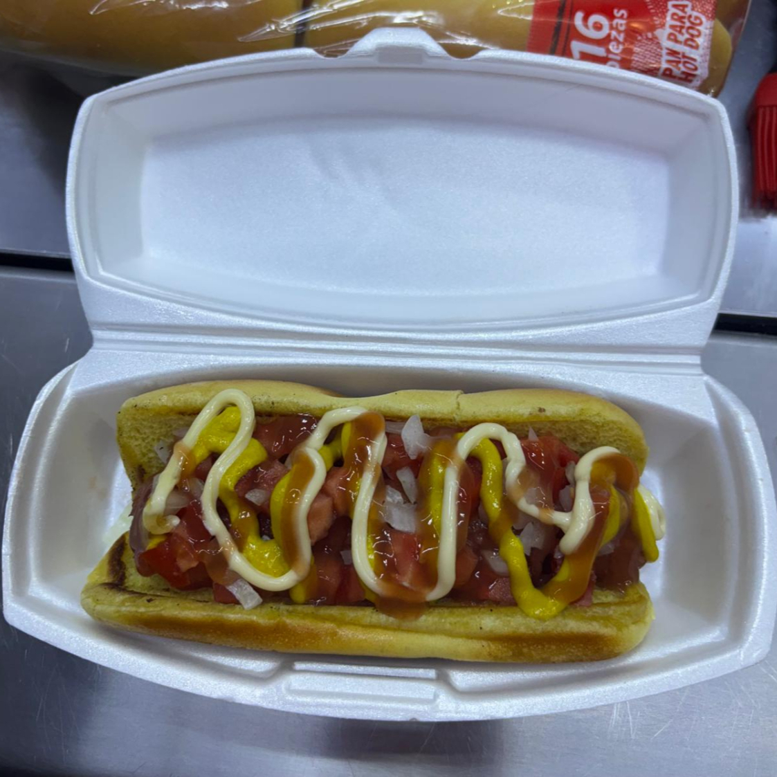 salchicha de pavo, jitomate, cebolla, mostaza, mayonesa catsup