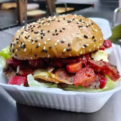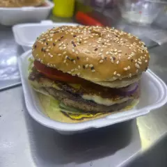 80g carne sasonada, salchichon, jamon, queso mozarella, queso cheddar, jitomate, lechuga, aguacate, cebolla,pan con ajonjoli, mayonesa, mostaza y salsa catrup.
