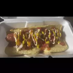 Salchicha de pavo, jitomate, cebolla, mayoneza, mostaza, catsup