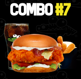 Deliciosa hamburguesa a base de pechuga de pollo 150 g, acompañada de aderezo honey sauce hot, 2 aros de cebolla empanizados, tocino y cheesse dip.