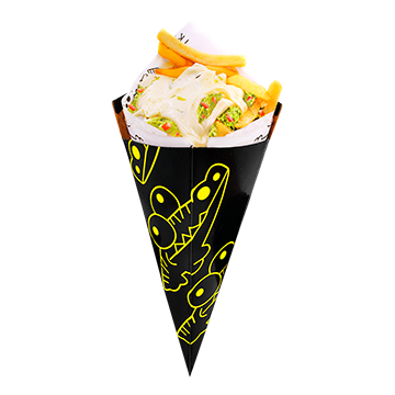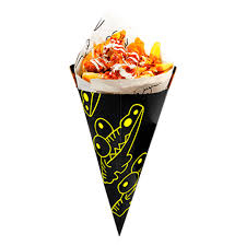 Pechuga crispy, salsa de queso, jalapeños en rodaja, queso manchego, aderezo mango hot y takis fuego.