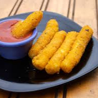 4 piezas de dedos de queso mozzarella empanizados.