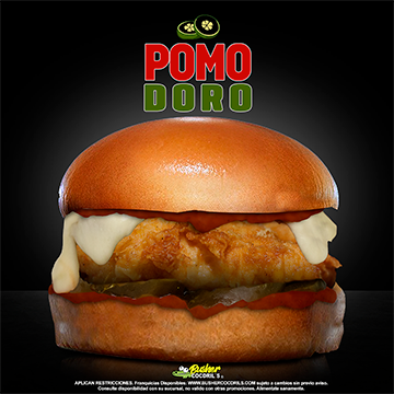 Pechuga crispy, salsa de tomate, pepinillos, queso gratinado.