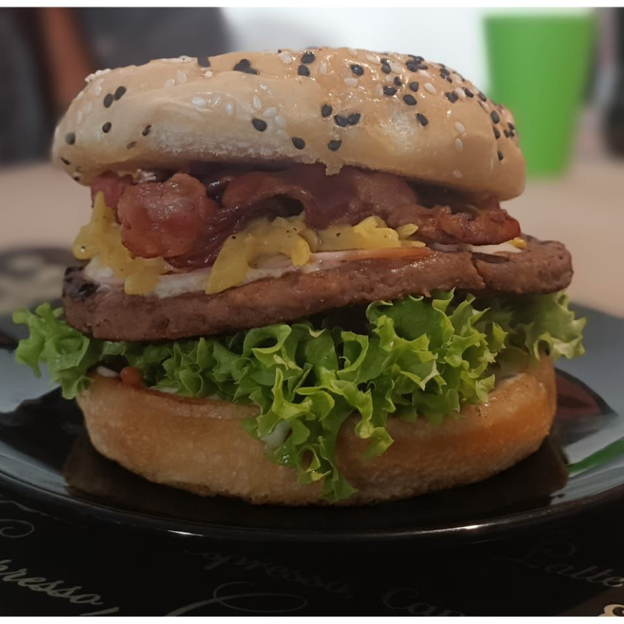 Carne 100% de Res Artesanal, cebolla cocinada sazonada, vegetales, jamon, queso suizo, chorizo, huevo estrellado y chipotle