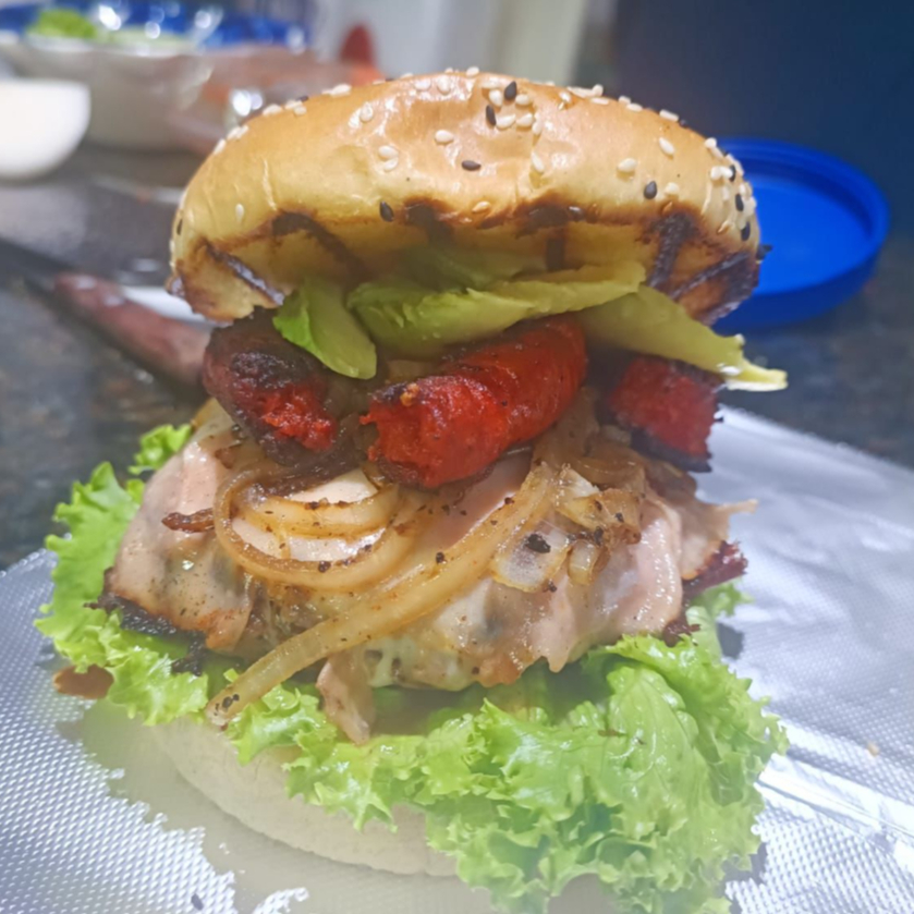 Carne 100% de Res Artesanal, cebolla cocinada sazonada, vegetales, jamon, queso suizo, chistorra, aguacate y chipotle