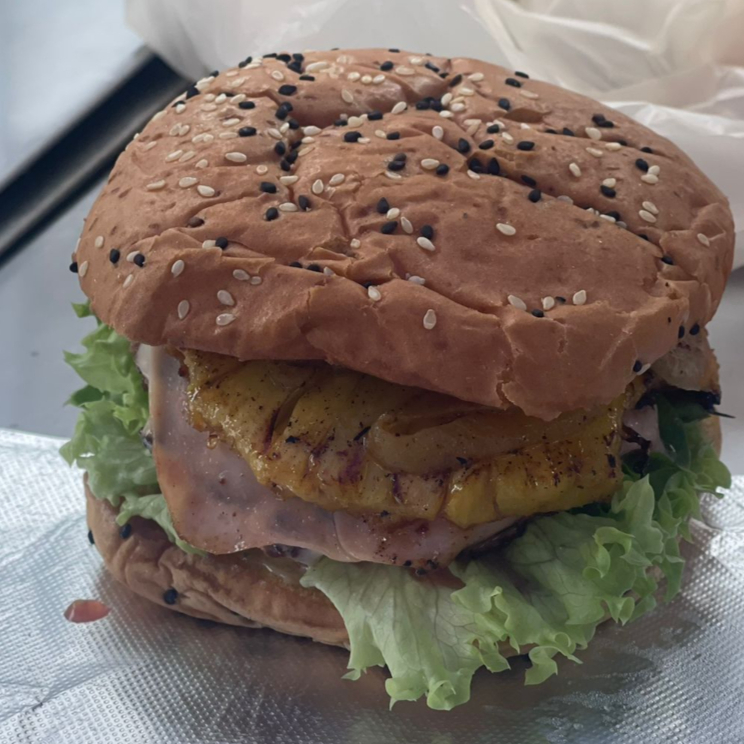 Carne 100% de Res Artesanal, cebolla cocinada aderezada con mostaza y otras especies, vegetales, jamon, queso suizo, piña, catsup
