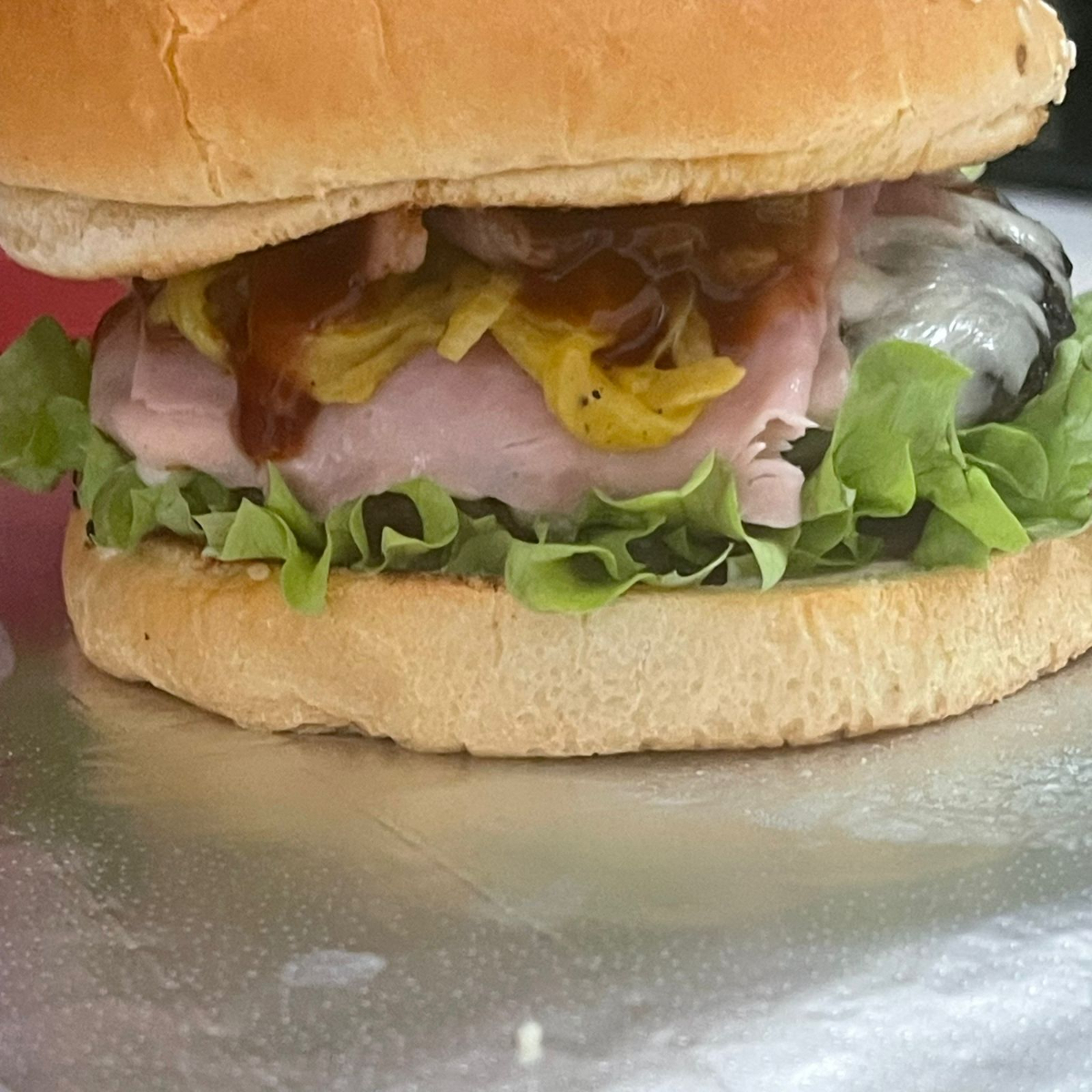 Carne 100% de Res Artesanal, cebolla cocinada marinada con mostaza y otras especies, vegetales, jamón, queso suizo, tocino y catsup