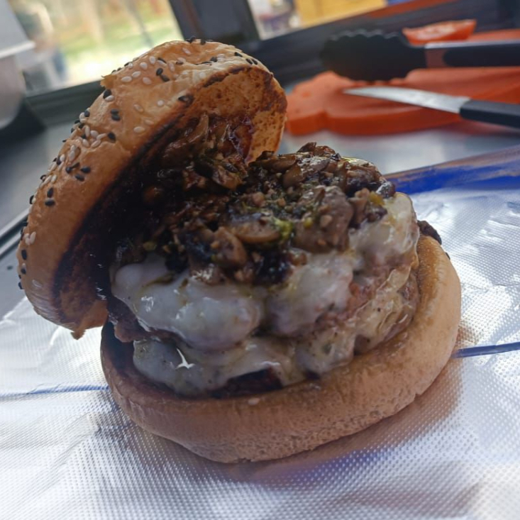 Carne 100% de Res Artesanal, cebolla cocinada sazonada, queso suizo y BBQ