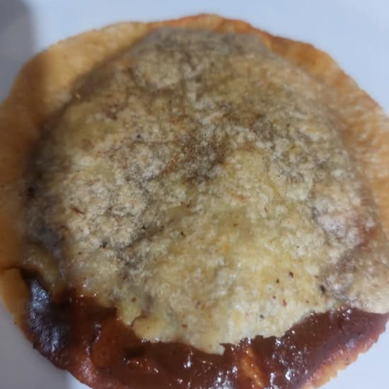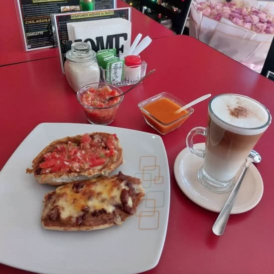 Pan bolillo con frijoles refritos y queso gratinado, acompañados de pico de gallo. Incluyen huevo frito o revuelto bajo el queso gratinado.