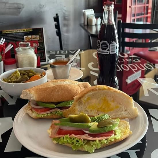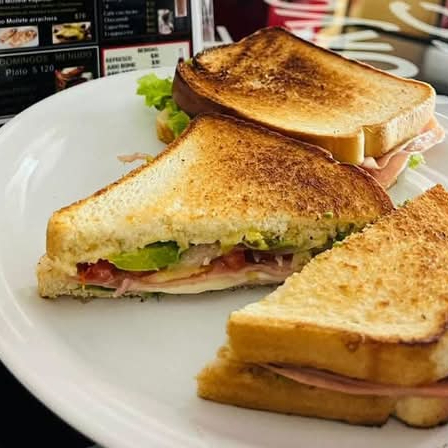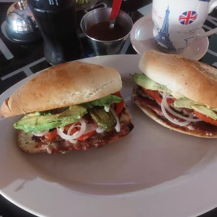 Rebanadas de jamón, frijoles refritos, queso fresco, tomate, cebolla, lechuga, mayonesa, aguacate y jalapeños encurtidos intercalados entre pan bolillo tostado o telera.