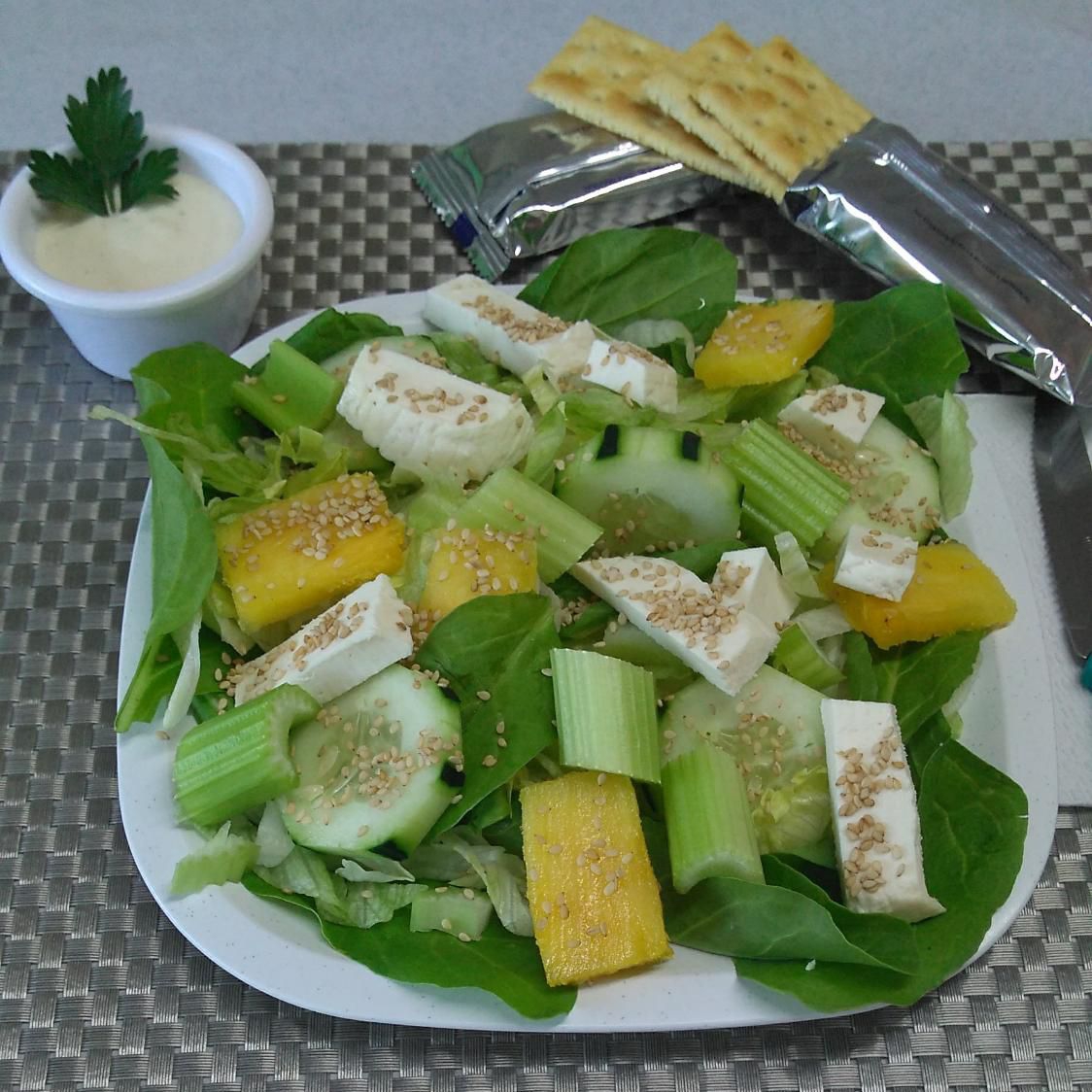 Lechuga, espinacas, pepino, apio, queso blanco, piña, ajonjolí, aderezo, mitad de limón y galletas saladas para 1 persona. .