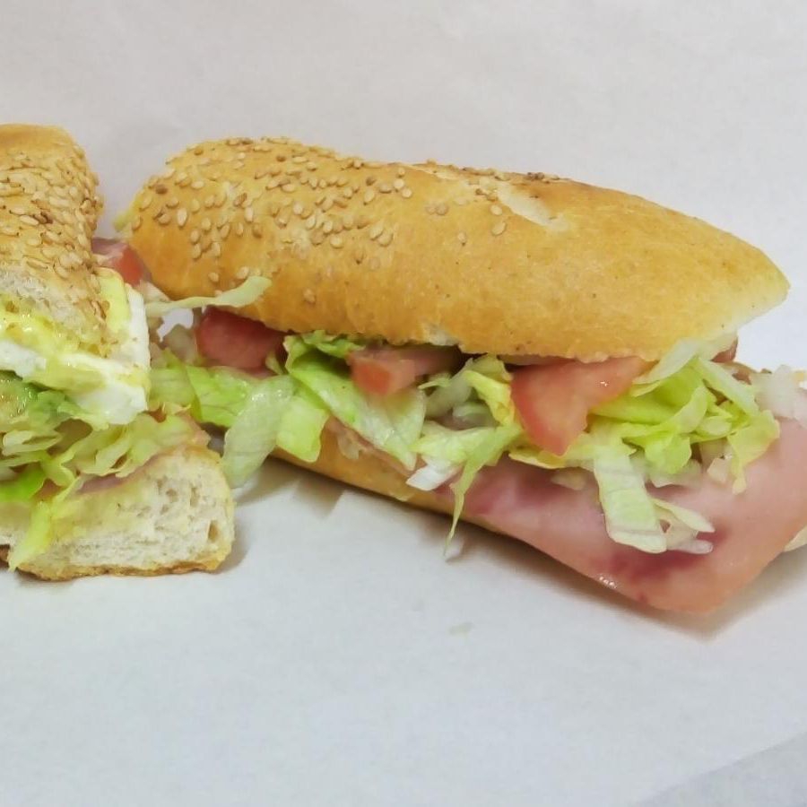 Baguette con jamón de pavo, aderezos, lechuga, jitomate, cebolla, aguacate, queso blanco y chile nacho en vinagre.
