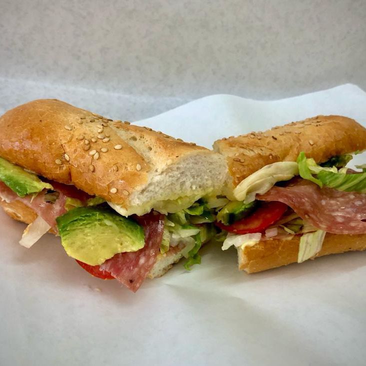 Baguette con salami, aderezos, lechuga, jitomate, cebolla, aguacate, queso provolone y chile nacho en vinagre.