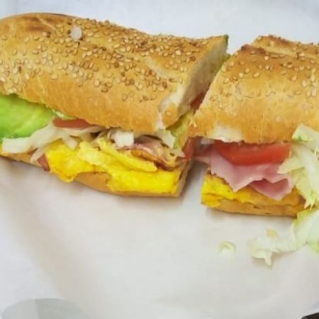 Baguette de huevo con jamón de pavo, aderezos, lechuga, jitomate, cebolla, aguacate, queso blanco y chile nacho en vinagre.