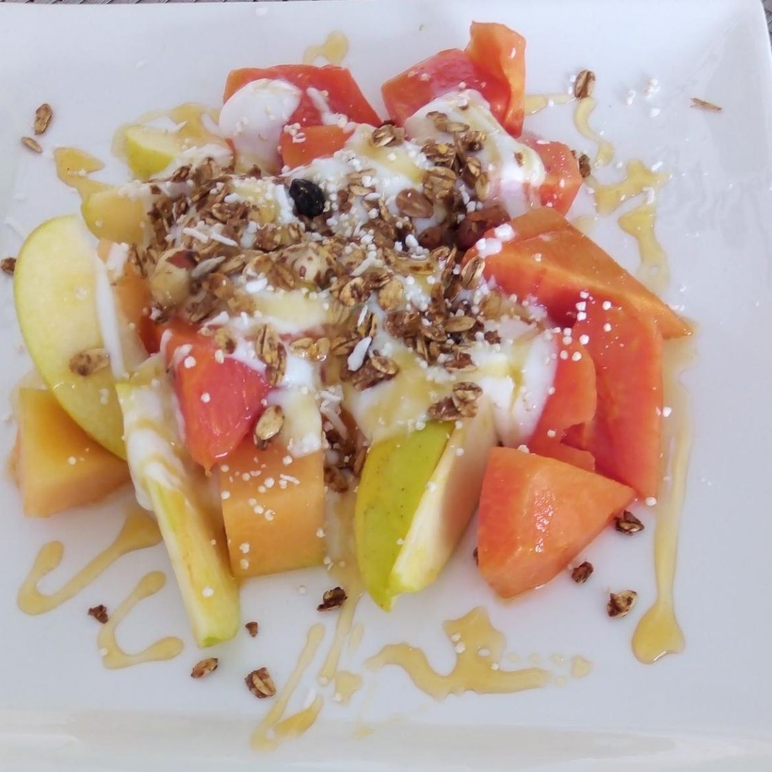 Papaya, melón, manzana, guayaba, plátano, Yoghurt natural, granola y miel de abeja. Vaso de 600 ml.