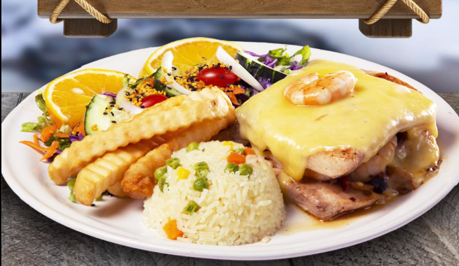 Platillo con 180 g de camarones empanizados, coco rallado, crema de coco y fruta en almíbar.