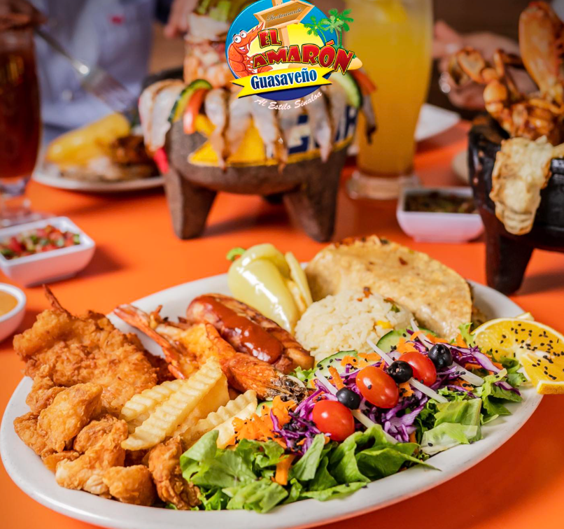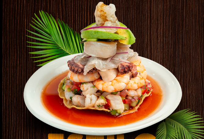 camaroneros cocido, camarón aguachile, pulpo, atún, mango, pepino, cebolla, bañada en salsa de la casa.