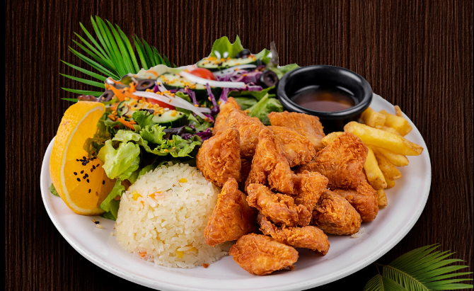 Chicharrón con 180 g de filete y empanizados en trozos. acompañado de papas ensalada y arroz