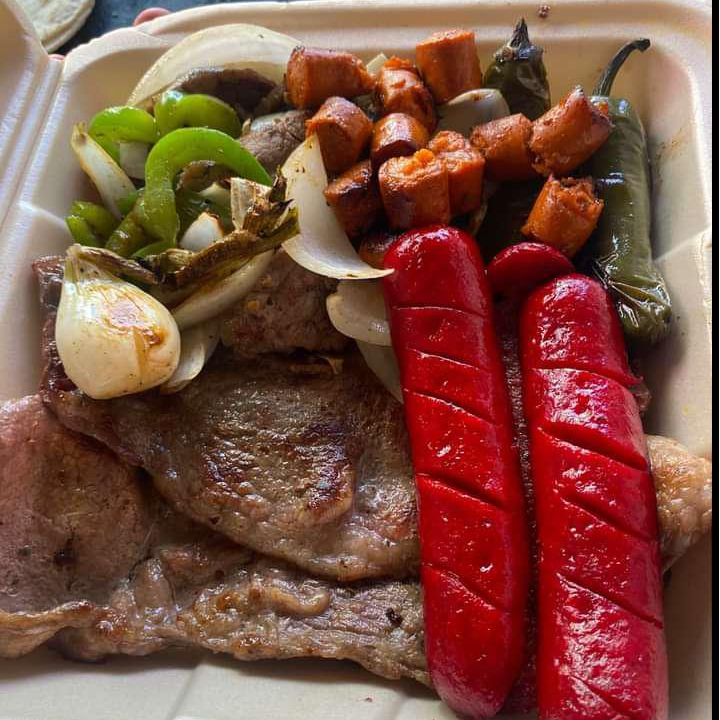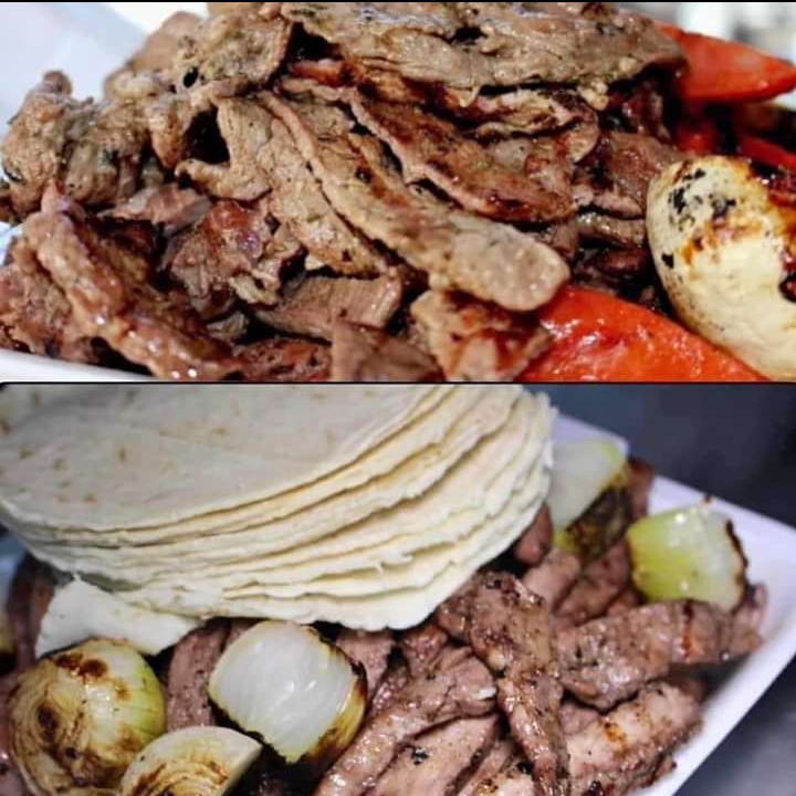 Incluye: 500 Grs de sabrosa carne asada al carbón (Fajitas de Res Marinadas) Chiles toreados, cebollíta asada, 4 mitades de salchichon asado en la parrilla, nopalitos, salsita tatemada.