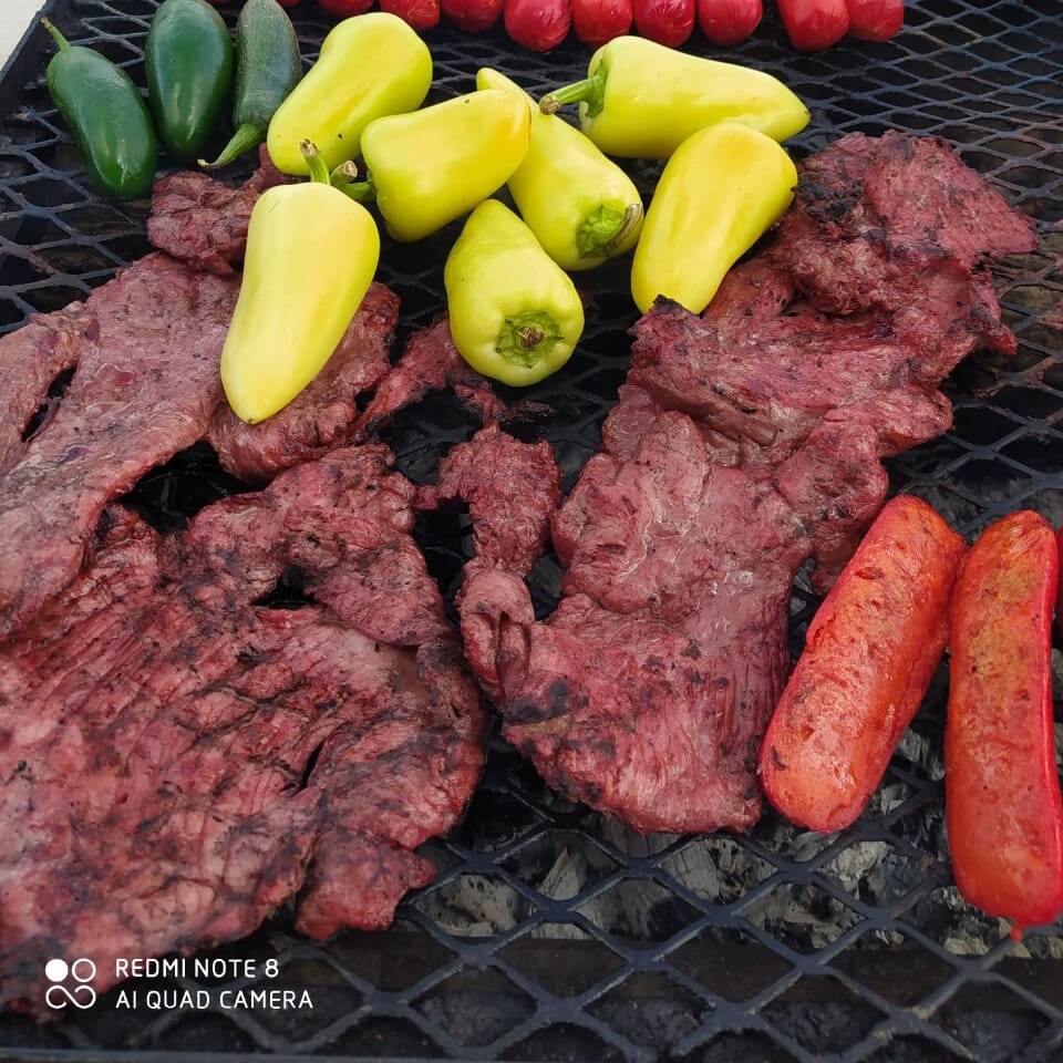 Incluye: 1 Kg de sabrosa carne asada al carbón (Diezmillo marinado) Chiles toreados, cebollíta asada, 8 mitades de salchichon asado en la parrilla, nopalitos, salsita tatemada.