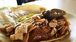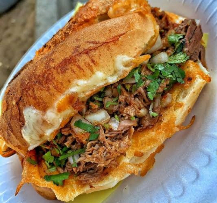 Torta de barbacoa de res, incluye salsa roja, salsa verde, cebolla y cilantro.