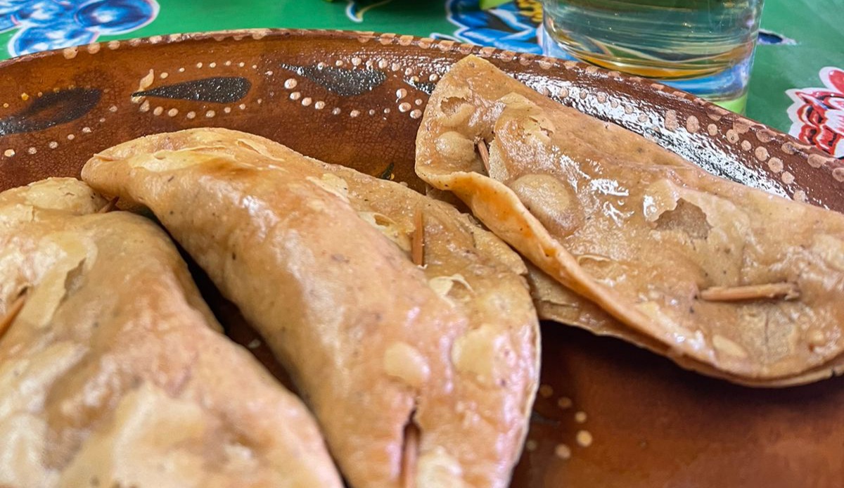 1 quesadilla frita de papa, salsa roja, salsa verde y cebollas picosas