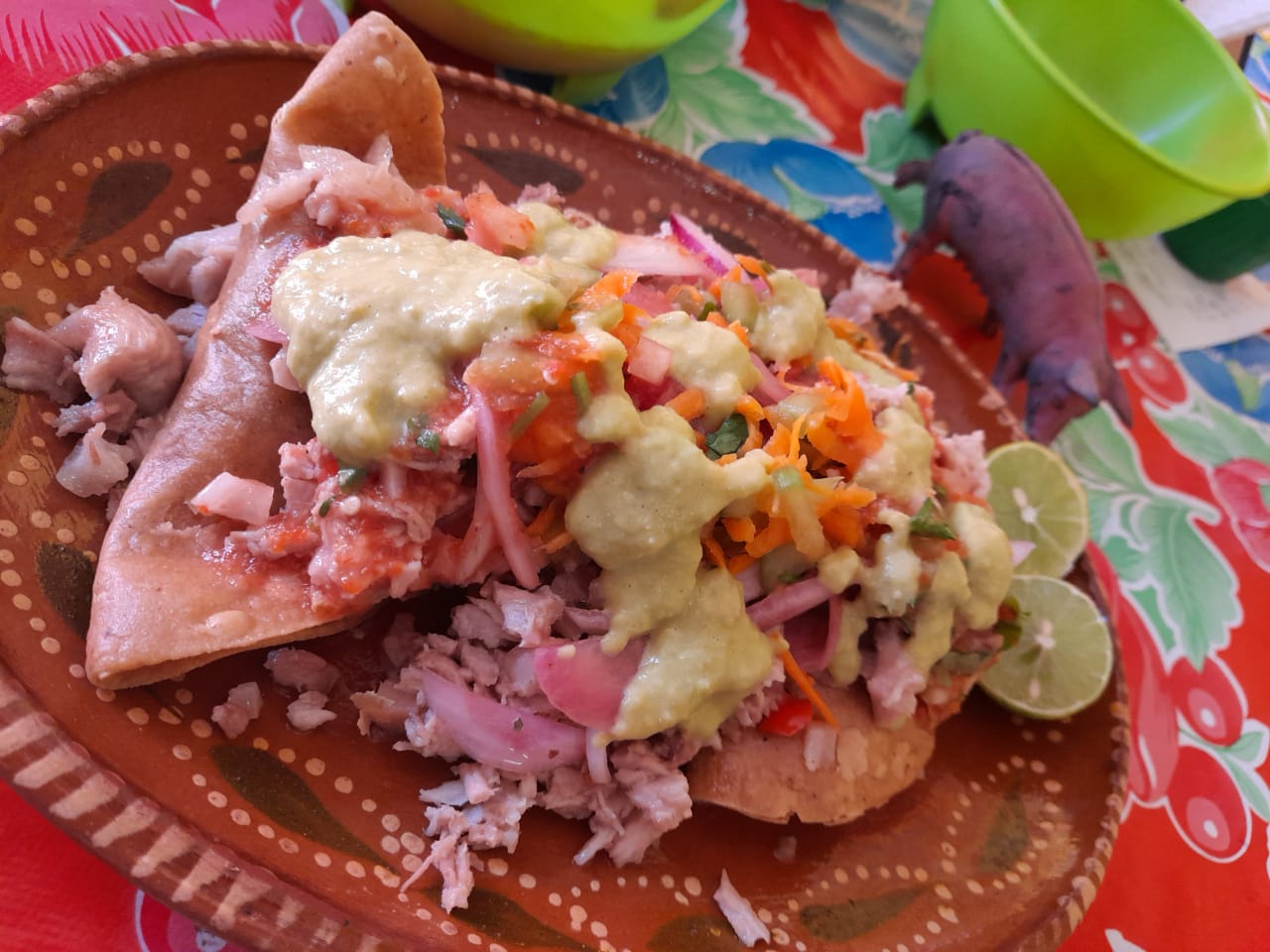Carnitas surtidas sobre 4 quesadillas fritas de papa, salsa verde, salsa roja y Cebollitas picosas