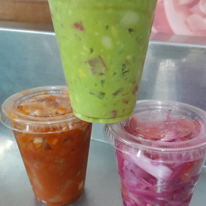 Paquete vaso, incluye 1 vaso de guacamole, 1 vaso de cueritos, 1 vaso de cebollita morada. Acompañado de totopos
