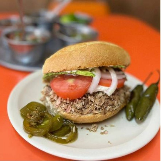 Torta de jugosa aldilla y costilla, servida en un pan suave con todo el sabor y textura que te encantará.