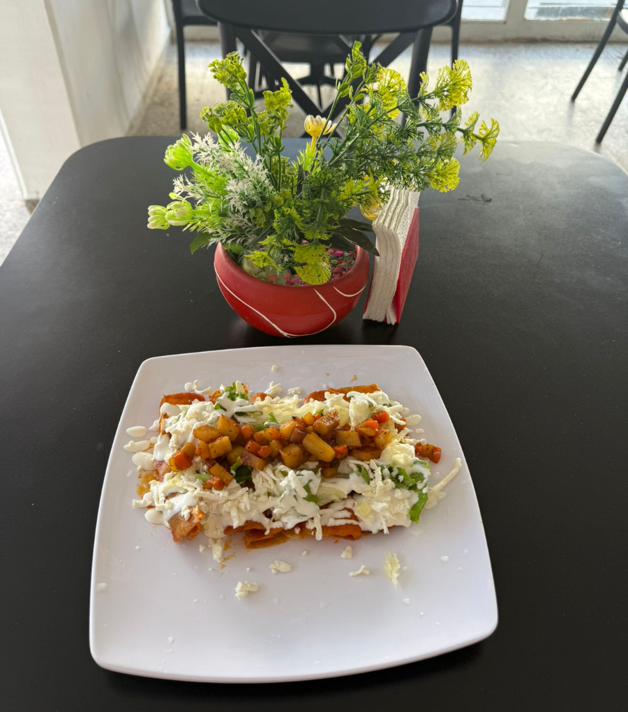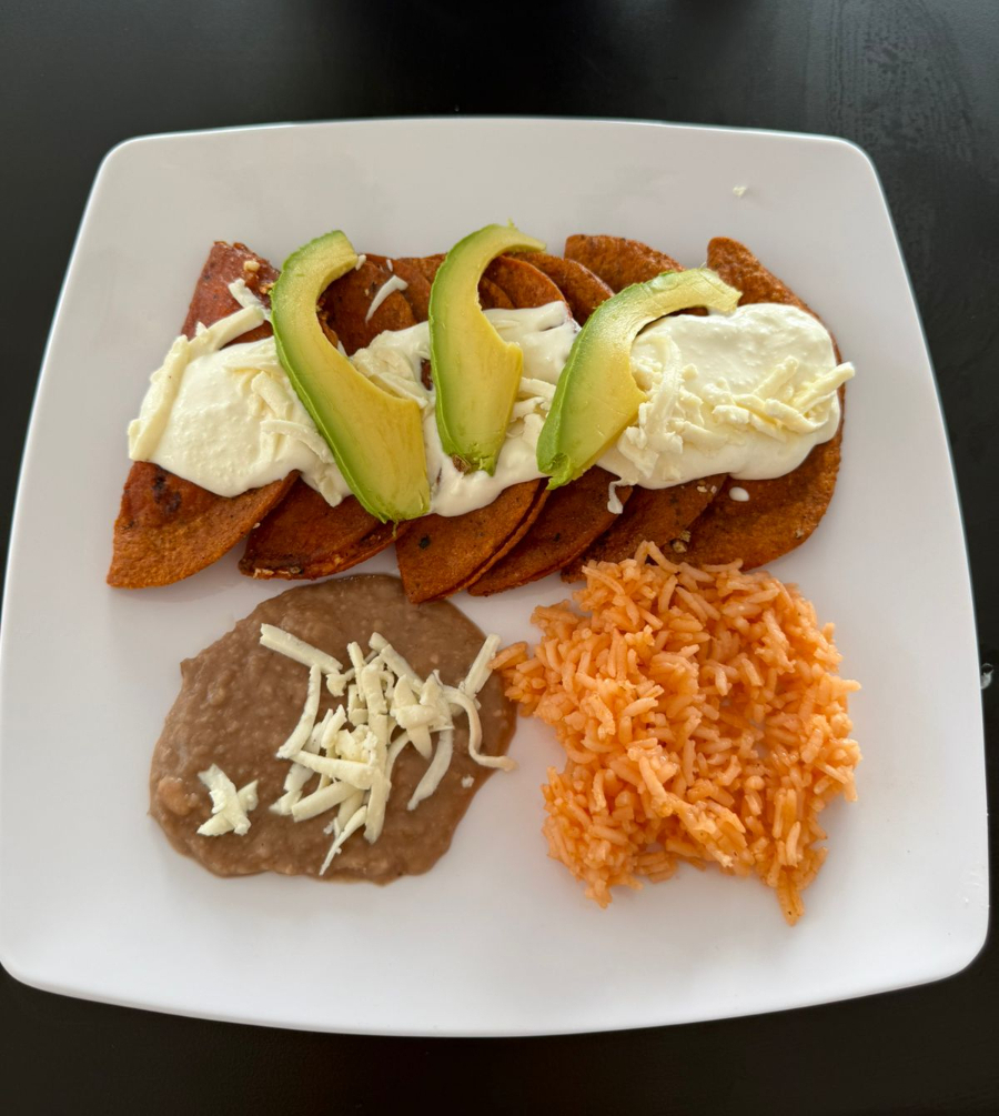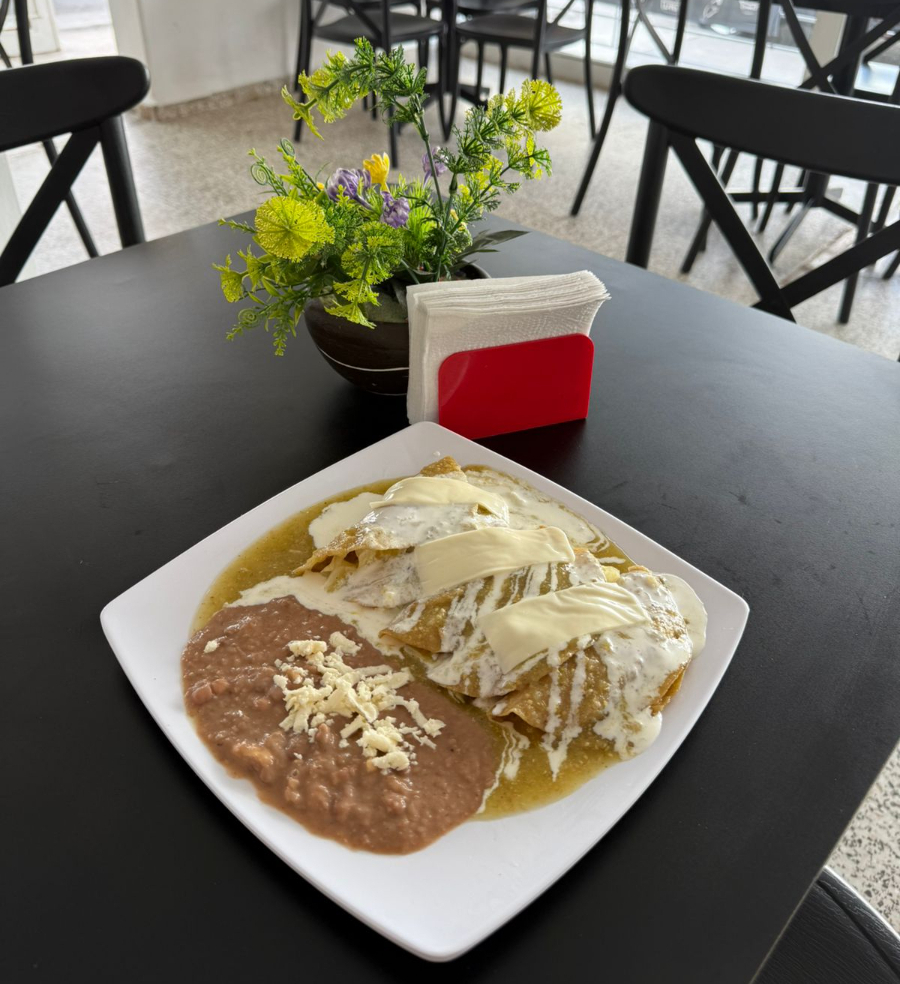 Crujientes totopos de tortilla de maíz bañados en salsa roja o verde elaborada con tomate fresco, cebolla, ajo y chile serrano, sazonada con sal y un toque tradicional. Se acompañan con huevo fresco revuelto.