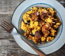 Huevos revueltos con chorizo mexicano elaborado con chiles secos, ajo, orégano y comino, que aporta un sabor intenso y tradicional, acompañados de frijoles refritos.