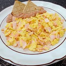 Huevos frescos preparados y mezclados con jamón de calidad, ligeramente salteado con un toque de cebolla y sazonado con sal y pimienta, acompañados de frijoles refritos.