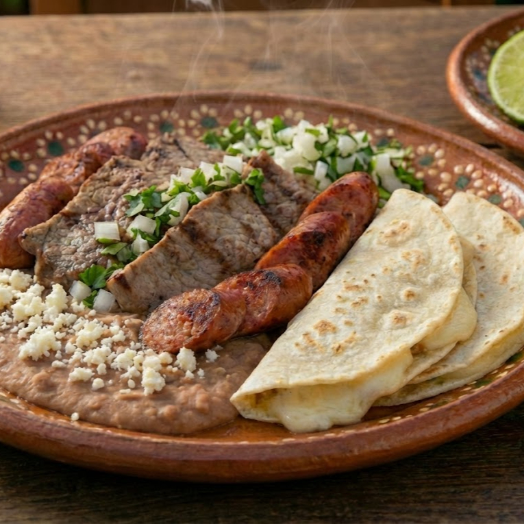 carne especial. Bistec de puerco con salchicha asadero con frijoles y quesadillas de queso.
