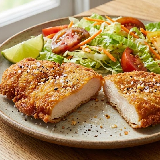 Pechuga de pollo empanizada y frita a la perfección, sazonada con sal, pimienta y ajo, servida con una fresca guarnición de lechuga, jitomate y zanahoria.