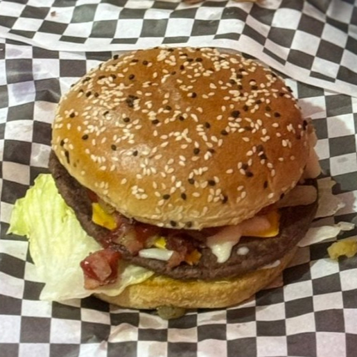 Carne de res 56 g, lechuga, queso amarillo, tomate, cebolla, jalapeños, catsup
