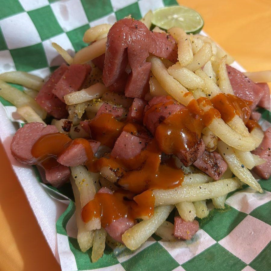 Trocitos de salchicha con papas a la francesa, catsup, salsa valentina, limón, sazonador pimienta limón.