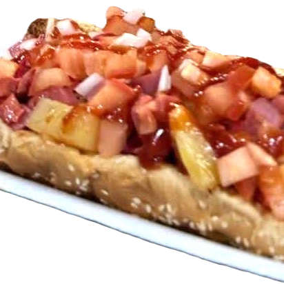 Salchicha 40g envuelta en tocino, salchicha, jamón, piña, tomate, cebolla, jalapeños, catsup