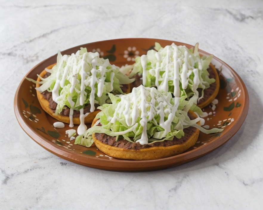 Base de maíz frita cubierta con frijoles, lechuga, queso y crema.